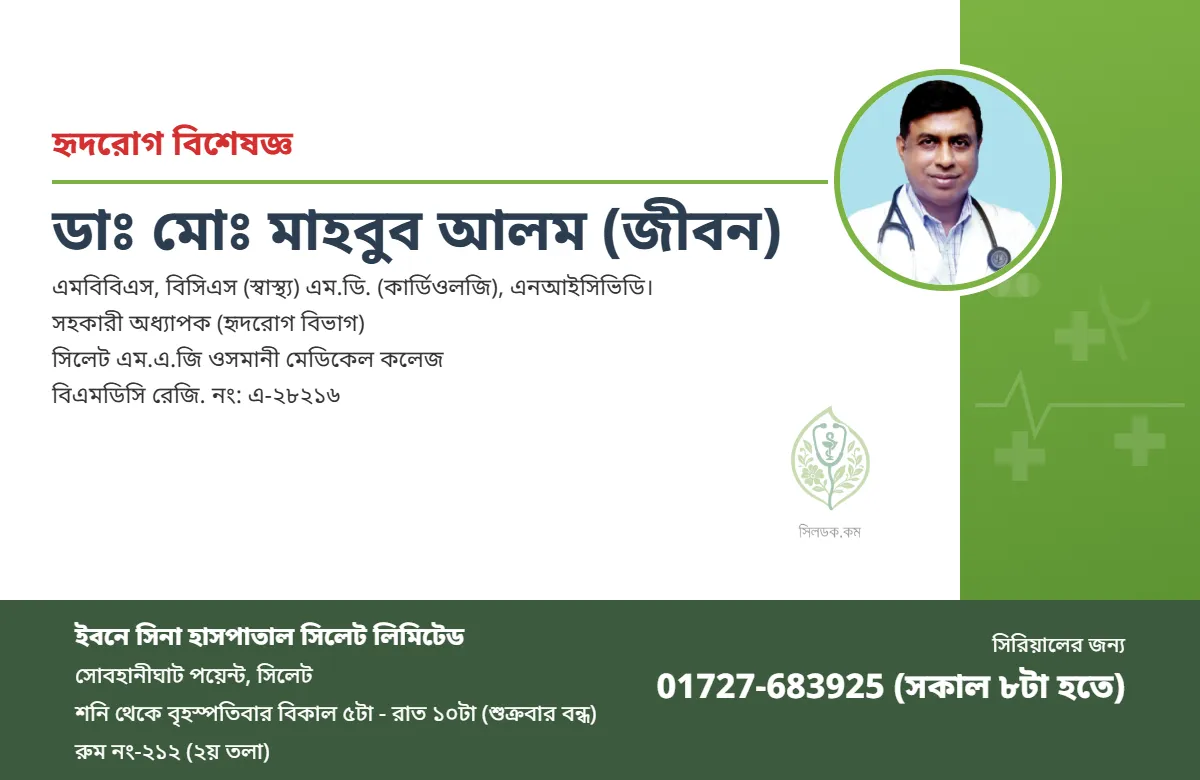 সহকারী অধ্যাপক (হৃদরোগ বিভাগ) সিলেট এম.এ.জি ওসমানী মেডিকেল কলেজ বিএমডিসি রেজি. নং: এ-২৮২১৬
