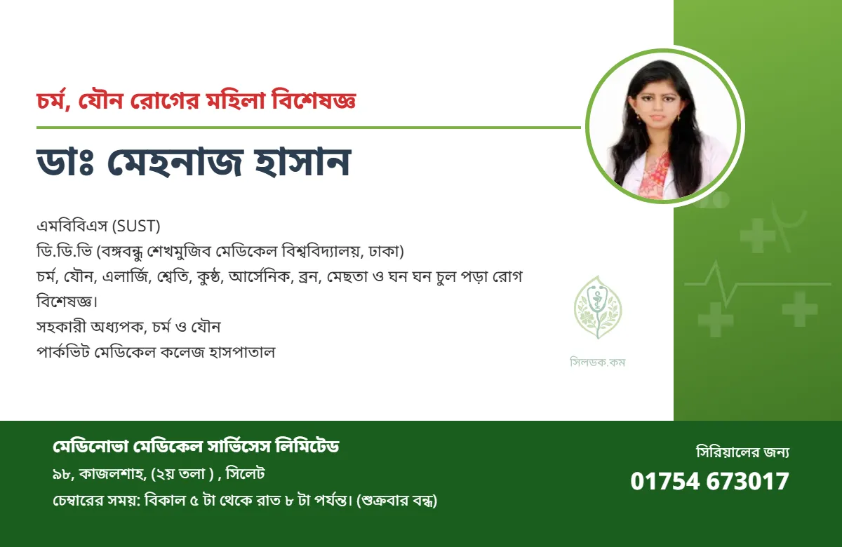 এমবিবিএস (SUST) ডি.ডি.ভি (বঙ্গবন্ধু শেখমুজিব মেডিকেল বিশ্ববিদ্যালয়, ঢাকা) চর্ম, যৌন, এলার্জি, শ্বেতি, কুষ্ঠ, আর্সেনিক, ব্রন, মেছতা ও ঘন ঘন চুল পড়া রোগ বিশেষজ্ঞ।