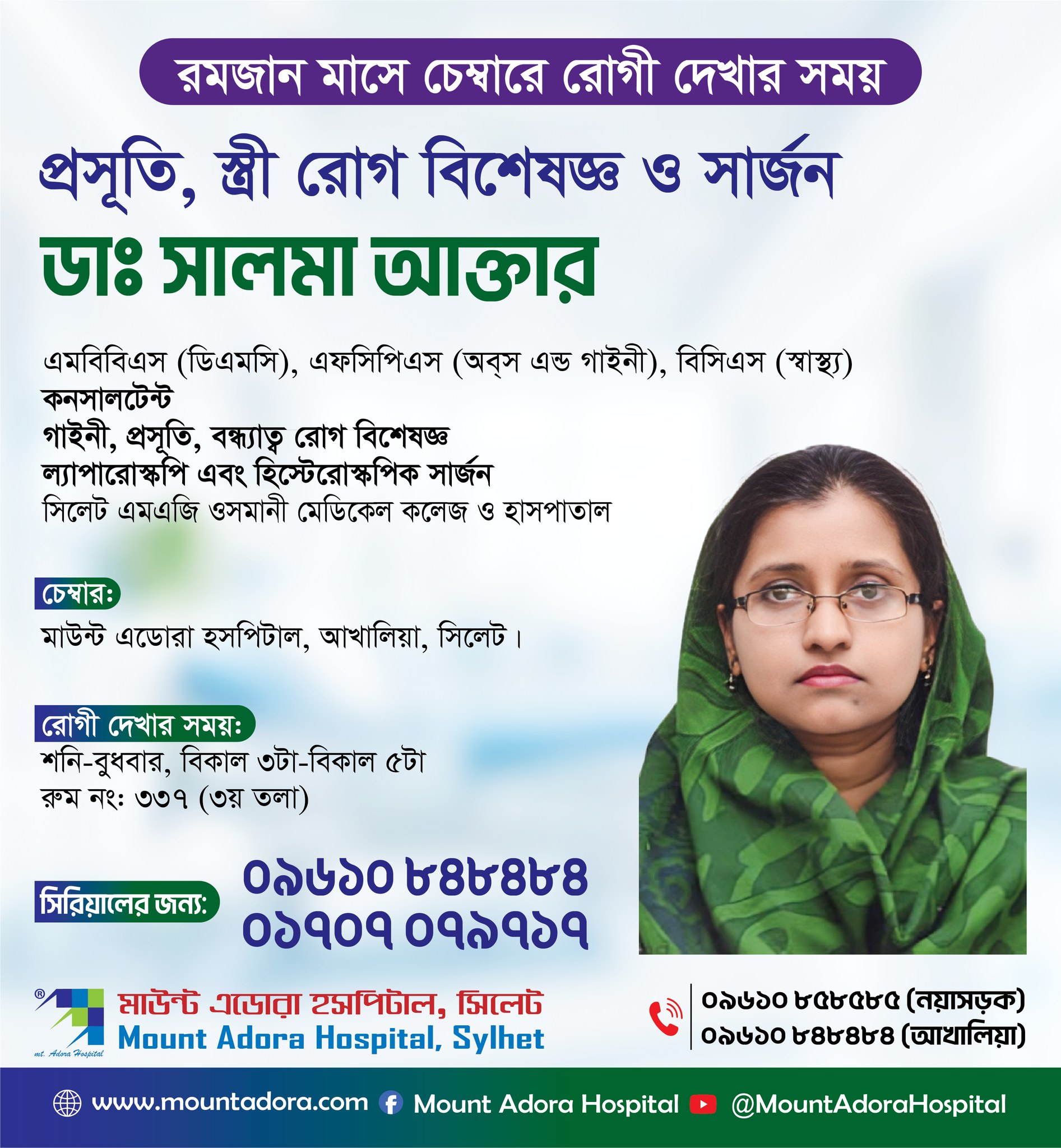 কনসালটেন্ট গাইনী, প্রসূতি, বন্ধ্যাত্ব রোগ বিশেষজ্ঞ ল্যাপারোস্কপি এবং হিস্টেরোস্কপিক সার্জন সিলেট এমএজি ওসমানী মেডিকেল কলেজ ও হাসপাতাল