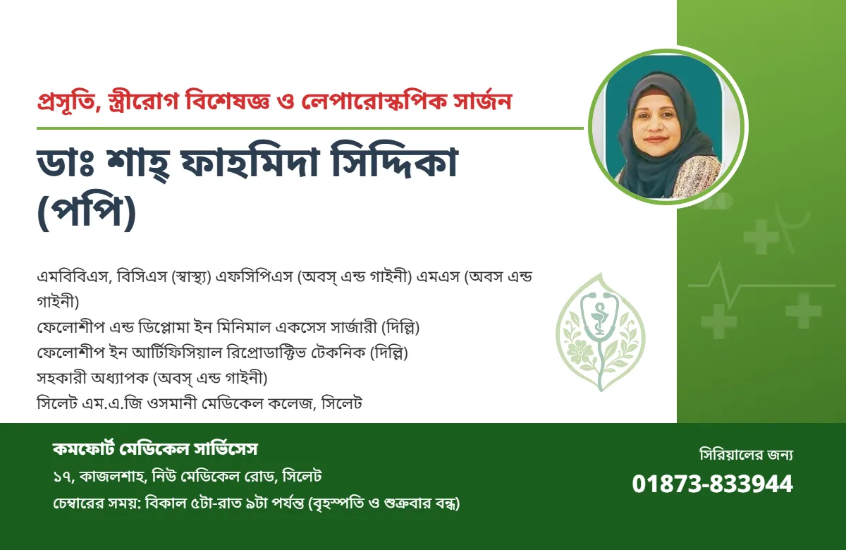সহকারী অধ্যাপক (অবস্ এন্ড গাইনী) সিলেট এম.এ.জি ওসমানী মেডিকেল কলেজ, সিলেট
