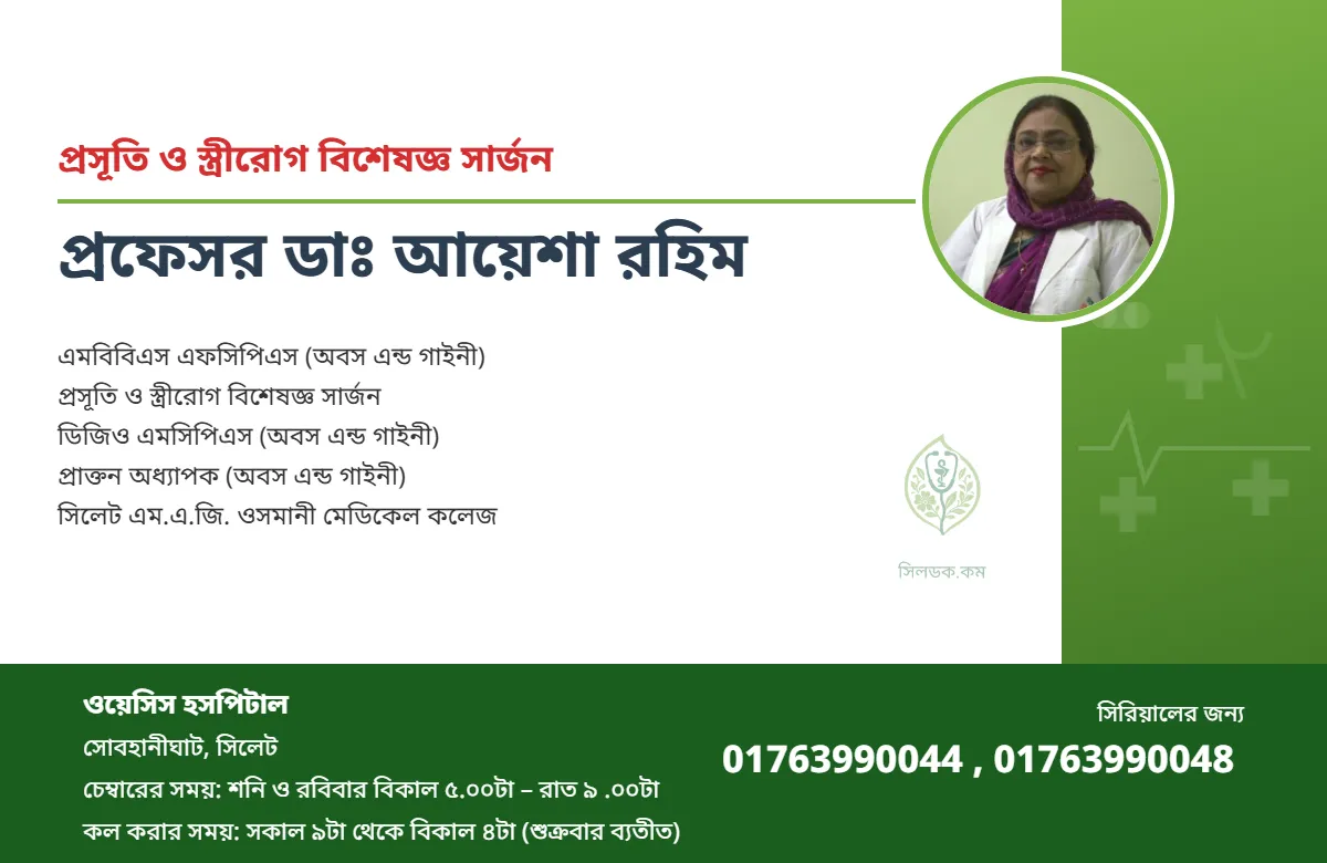 এমবিবিএস এফসিপিএস (অবস এন্ড গাইনী) প্রসূতি ও স্ত্রীরোগ বিশেষজ্ঞ সার্জন ডিজিও এমসিপিএস (অবস এন্ড গাইনী) প্রাক্তন অধ্যাপক (অবস এন্ড গাইনী) সিলেট এম.এ.জি. ওসমানী মেডিকেল কলেজ