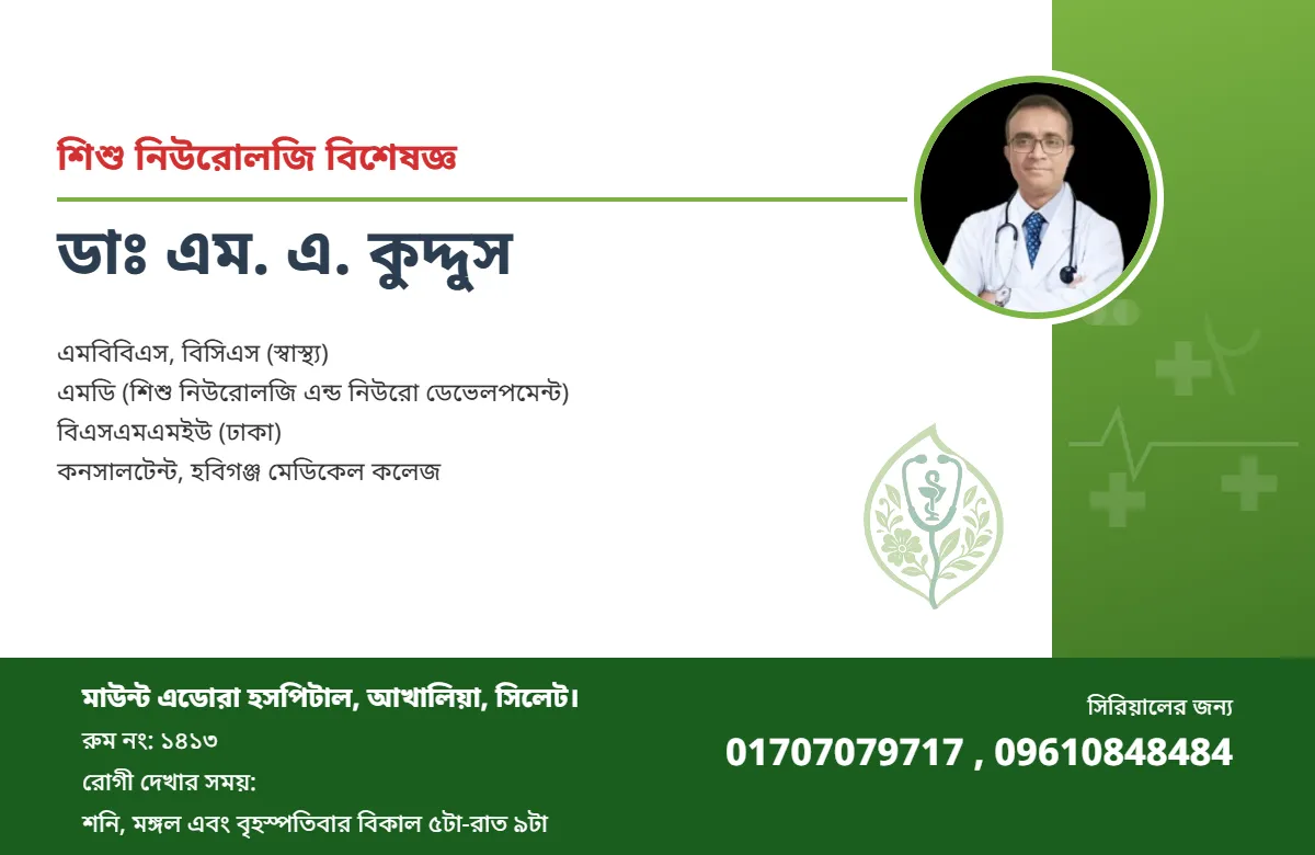 এমবিবিএস, বিসিএস (স্বাস্থ্য) এমডি (শিশু নিউরোলজি এন্ড নিউরো ডেভেলপমেন্ট) বিএসএমএমইউ (ঢাকা) কনসালটেন্ট, হবিগঞ্জ মেডিকেল কলেজ