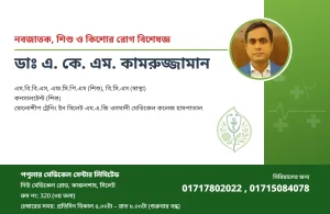 এম.বি.বি.এস, এফ.সি.পি.এস (শিশু), বি.সি.এস (স্বাস্থ্য) কনসালটেন্ট (শিশু) ফেলোশীপ ট্রেনিং ইন সিলেট এম.এ.জি ওসমানী মেডিকেল কলেজ হাসপাতাল