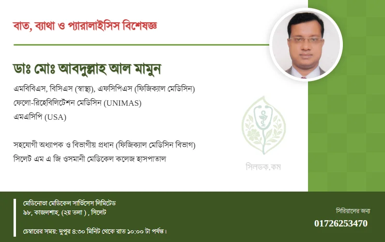 সহযোগী অধ্যাপক ও বিভাগীয় প্রধান (ফিজিক্যাল মেডিসিন বিভাগ) সিলেট এম এ জি ওসমানী মেডিকেল কলেজ হাসপাতাল