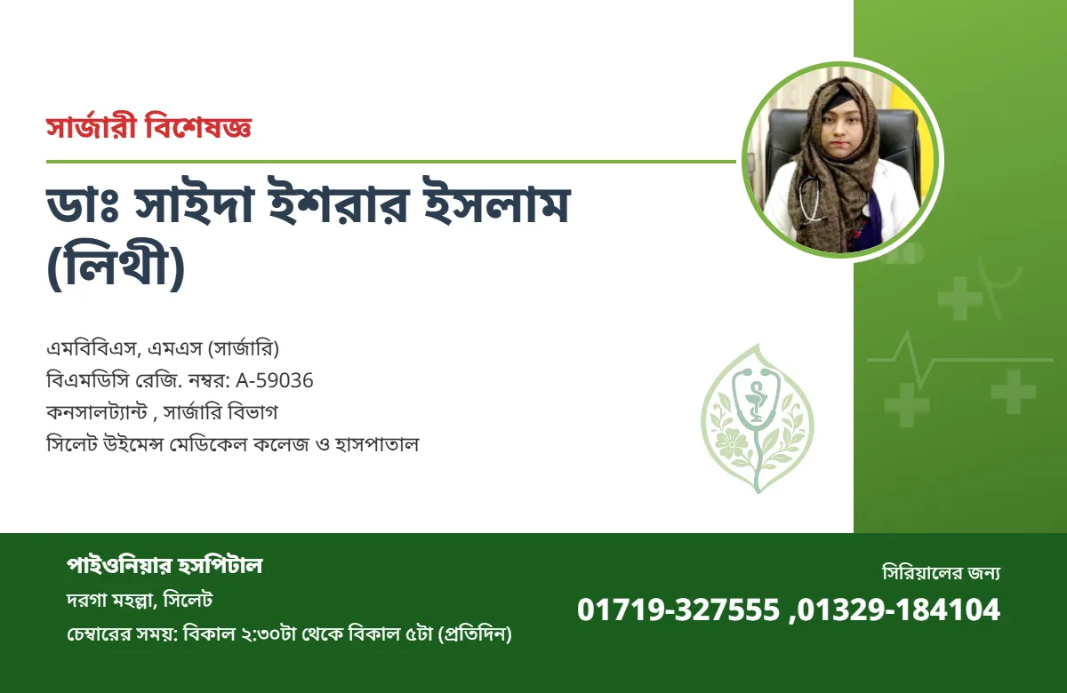 কনসালট্যান্ট , সার্জারি বিভাগ সিলেট উইমেন্স মেডিকেল কলেজ ও হাসপাতাল